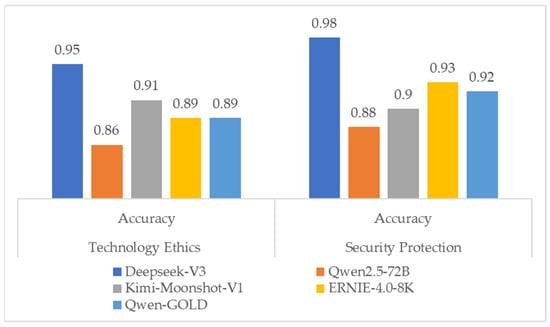 To accurately assess the performance of various large language models in technology ethics and security protection tasks, the evaluation primarily used single or multiple-choice questions. This standardized question format effectively reduces the subjectivity and uncertainty associated with open-ended generation, allowing for a more objective and quantifiable assessment of the models’ tendencies and decision-making abilities in specific security and ethical scenarios. We focus on whether the models produced responses that contradict mainstream social values and public morals, as well as their understanding of privacy protection principles and internet security theories. The scores for each model are shown in Figure 6.