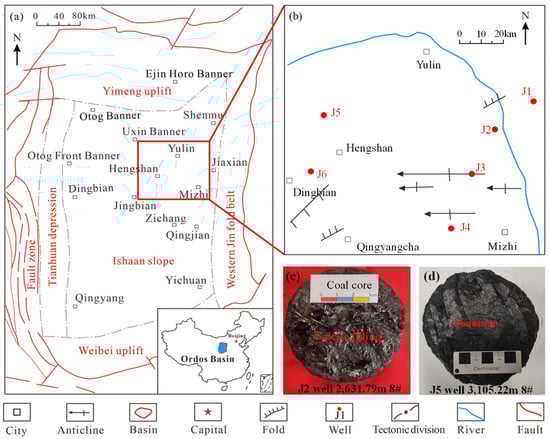 (a) The location and major secondary tectonic units of the Ordos basin; (b) tectonic outline of the Yulin area and distribution of coring well locations; (c) the deep 8# coal core of a typical well shows directional fracture development and (d) a calcite filling phenomenon.