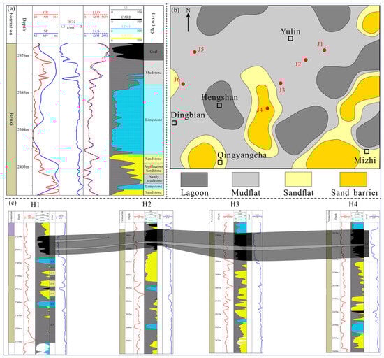 (a) The stratigraphic development of Benxi Formation of J2 well in the Ordos basin; (b) the distribution characteristics of sedimentary microfacies of C1b; (c) the distribution of coal seam in north–south direction. SH represents mudstone; CARB represents coal; LIME represents limestone; SAND represents sandstone.