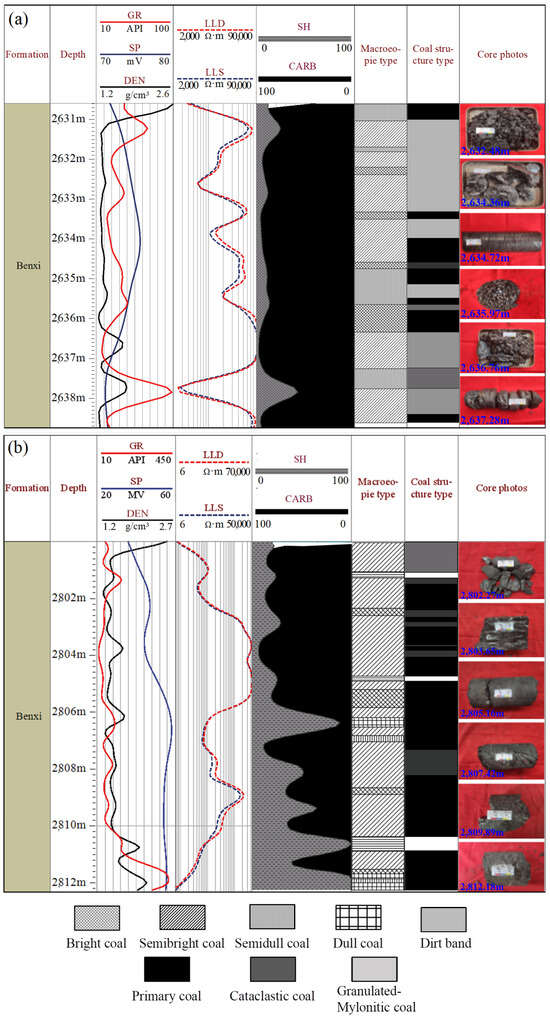 Logging response characteristics, macroscopic type, coal structure type, and core photographs of deep 8# coal of Benxi Formation in J2 (a) and J3 (b) wells.