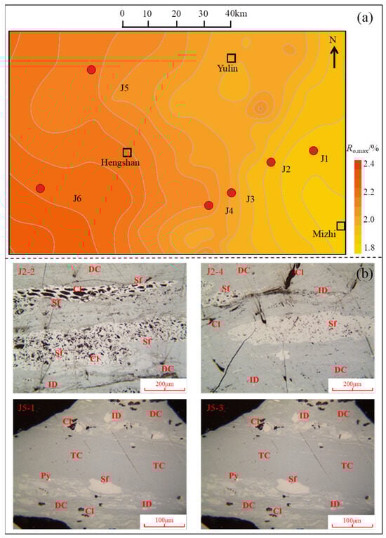 (a) The Ro,max distribution and (b) characterization of macerals of the deep 8# coal, J2-2, Ro,max = 2.02%; J2-4, Ro,max = 2.14%; J5-1, Ro,max = 2.08%; J5-3, Ro,max = 1.96%. DC—Matrix vitrinite;; Sf—Semifusinite; Py—Pyrite; Cl—Clay; ID—Inertodetrinite.