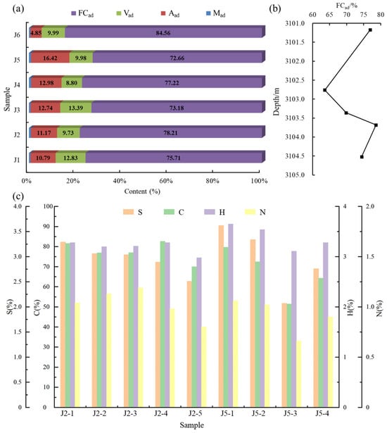 Proximate analysis results of deep 8# coal in the coring well (a), vertical change of FCad in J5 well (b), and the total sulfur content (S) and mainly elemental analysis results (C, H, N) of deep 8# coal (c). Mad: moisture content, Aad: ash content, Vad: volatile matter content, and FCad: fixed carbon content.