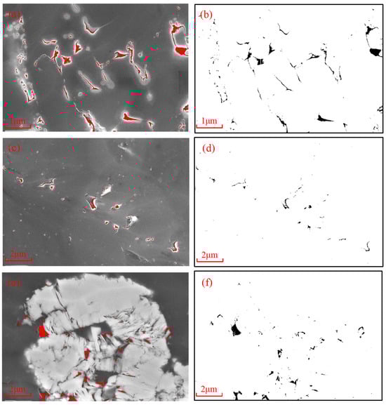 (a,c,e) Photographs under FESEM and (b,d,f) binarized images of different types, sizes, and shapes of pores in deep 8# coal. (a,b) represent gas pores and irregular-shaped pores in organic matter in the J2 well; (c,d) represent round and irregular-shaped gas pores in the J5 well; (e,f) represent intercrystallite pores in the J5 well.