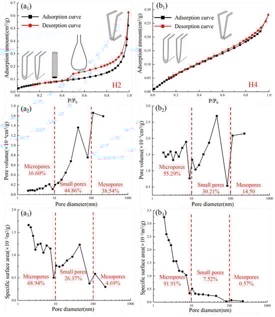 The pore size distribution characteristics of deep 8# coal based on the LNA experiment. (a1,b1) The adsorption and desorption curves of liquid nitrogen and the main pore morphology; (a2,b2) the pore volume distribution and proportion of different pore size stages; (a3,b3) the development and proportion of pore specific surface area in different pore size sections. P/P0 represents the ratio of the partial pressure of the adsorbed gas to the saturated vapor pressure of the adsorbate at this temperature in the LNA experiment.