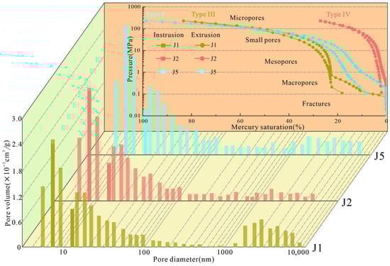MIP experiments are also one of the most commonly used methods for analyzing the pore structure characteristics of coal. Compared to low-temperature liquid nitrogen adsorption/desorption experiments, the advantage of high-pressure mercury intrusion experiments lies in the testing range of mesopores and macropores. The experiment involves injecting mercury into a vacuum-pumped coal, gradually increasing the mercury pressure to make mercury enter smaller pores. By comparing the efficiency of mercury intrusion and extrusion, information such as pore volume, pore size distribution, and pore connectivity can be obtained [37,38]. Based on the classification of mercury intrusion–extrusion curve shapes by previous researchers, the deep 8# coal exhibits three main types of curves, namely type I, type III, and type IV [39].