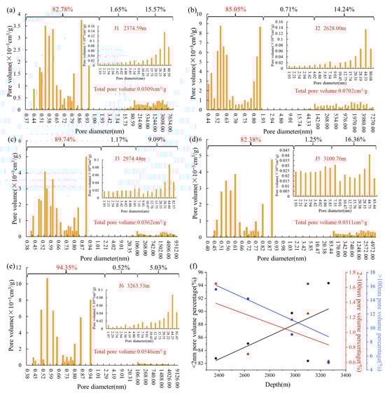 Joint characterization of pore size distribution (a–e) with CO2 adsorption, LNA and MIP methods and pore volume ratio of different pore size segments (f) of deep 8# coal.
