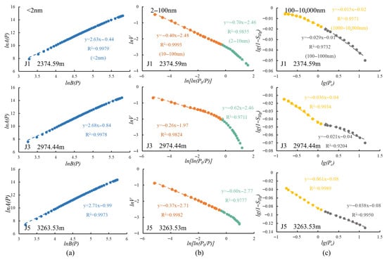 For small pores (2–100 nm), the fractal dimension can be calculated according to the FHH model using LNA data. The calculation formula is as follows (Figure 10b):