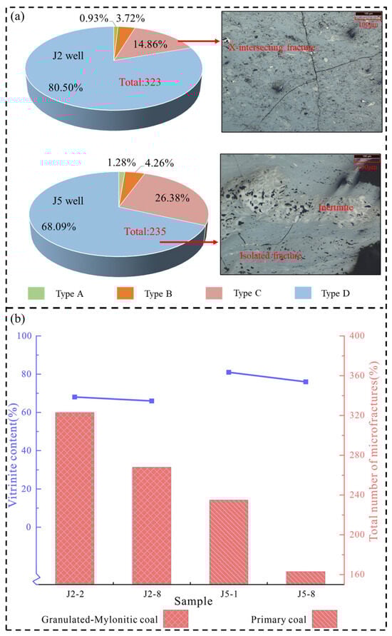 Microscopic fractures can be classified into four types based on their width and extension length: type A (width ≥ 5 μm and length ≥ 10 mm, good continuity, extensive extension), type B (width ≥ 5 μm and length < 10 mm, similar to the main part of a tree branch-like fracture), type C (width < 5 μm and length ≥ 300 μm, relatively thin, extensive extension), and type D (width < 5 μm and length < 300 μm, poor directional and connectivity characteristics). The identification and classification of microscopic fractures in the deep 8# coal in wells J2 and J5 were conducted, and the statistical results are presented in Figure 11a.
