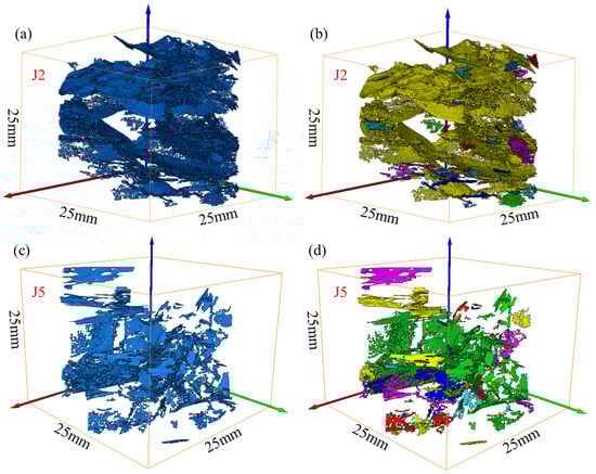 Three-dimensional reconstruction model (a,c) of microfracture of deep 8# coal (resolution is 22 μm) and identification (b,d) of connecting fractures (fractures of the same color are connecting).