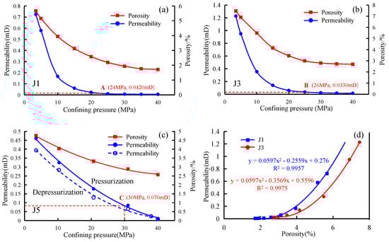 The porosity and permeability of coal are crucial indicators for evaluating coal reservoir properties. In this study, deep 8# coal plug samples (25 mm × 50 mm) were subjected to a maximum confining pressure of 40 MPa to simulate the stress conditions under geological formations, aiming to obtain in-situ porosity and permeability of the coal reservoir. Under overburden conditions, as the confining pressure increases, both coal permeability and porosity gradually decrease. The strong compressibility of coal matrix and well-developed fractures lead to a rapid decline in permeability and porosity during the initial stage of confining pressure loading due to the combined effects of matrix compression and fracture closure. However, as the confining pressure further strengthens, the rate of decline in permeability and porosity gradually slows down until it reaches a plateau. At the maximum confining pressure, the permeability of the deep 8# coal ranges from 0.0054 mD to 0.0163 mD, and the porosity varies from 1.72% to 2.69%. The permeability decreases with porosity in a power-law form (Figure 13). The original reservoir pressure is 24–30 MPa, corresponding to permeability and porosity values of 0.0330–0.0700 mD and 2.19–3.29%, respectively. This is comparable to the permeability (0.0150–0.0535 mD) and porosity (3.13–5.39%) of nearby blocks that have achieved preliminary commercial exploitation, indicating a promising development outlook for CBM. Moreover, the deep 8# coal sample in the J5 well, with numerous cracks generated during the drying process before the experiment, does not reach the minimum permeability and porosity even under a confining pressure of 40 MPa. As the confining pressure decreases, the permeability gradually increases, but it cannot recover to the permeability value during the loading process. In other words, loading and unloading processes result in a certain loss of permeability due to the plastic deformation of coal.