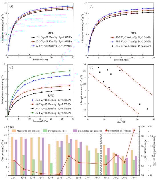 The adsorption performance of coal is a crucial parameter for quantitatively evaluating the coal seam gas storage capacity, and high-temperature, high-pressure isothermal adsorption experiments provide a direct means to understand the adsorption capacity of coal [46,47]. In this study, high-temperature (70–85 °C) and high-pressure (30 MPa) isothermal adsorption experiments were conducted on the deep 8# coal from wells J2, J5, and J6, with temperature and pressure settings based on the original geological conditions. The Langmuir volume (VL) of the deep 8# coal ranges from 12.36 cm3/g to 25.06 cm3/g, averaging at 20.78 cm3/g, and the Langmuir pressure (PL) ranges from 1.9 MPa to 4.17 MPa, averaging at 2.74 MPa (Figure 14a–c). The adsorption capacity of 8# coal in the J2 and J5 wells is strong, with an average maximum adsorption capacity of 23.69 cm3/g, and the VL of coal within the same well is similar. As burial depth increases, the positive effect of increased Ro,max on adsorption capacity is weaker than the negative effect of rising reservoir temperature, resulting in weaker adsorption capacity of coal at deeper coal seams. There is a significant difference in the adsorption capacity of coal at various locations in the J6 well, and under the same temperature, the VL of coal is lower than that of 8# coal in the J2 well, which is because the ash in coal is also an important factor affecting the adsorption capacity of coal. Ash cannot adsorb CH4, so as its content increases, the adsorption capacity of coal for methane decreases. That is, there is a negative correlation between the adsorption amount of coal in CH4 and Aad (Figure 14d). Additionally, the PL of coal gradually increases with increasing burial depth, indicating that as coal seams are buried deeper, gas appears faster during the process of dewatering and pressure reduction, which is beneficial for the development of deep CBM.