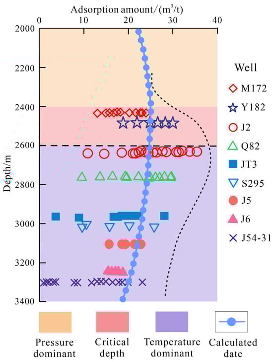 Furthermore, based on the isothermal adsorption experiments of coal at different temperatures, it was established that the VL and PL exhibit an exponential functional relationship with experimental temperature. By integrating the measured geothermal gradients and reservoir pressure gradients in the study area, a theoretical model for calculating CBM adsorption capacity was developed using the Langmuir equation. The variation characteristics of theoretical adsorption capacity with burial depth in the deep 8# coal seam were determined. Additionally, incorporating previous isothermal adsorption test results under in-situ temperature and reservoir pressure conditions of the deep 8# coal seam from other wells in the study area, the variation patterns of adsorbed gas content with burial depth in the deep 8# coal seam of the Yulin region were elucidated (Figure 15). The results show that as the burial depth of the coal seam increases, there exists a critical depth for deep gas content in the study area. By combining the adsorbed gas content and total gas content, it is determined that the critical depth lies between 2400 and 2600 m. Above the critical depth, reservoir pressure plays a dominant role in the occurrence state of gas. However, below the critical depth, the influence of reservoir temperature becomes stronger, which is consistent with previous analysis.