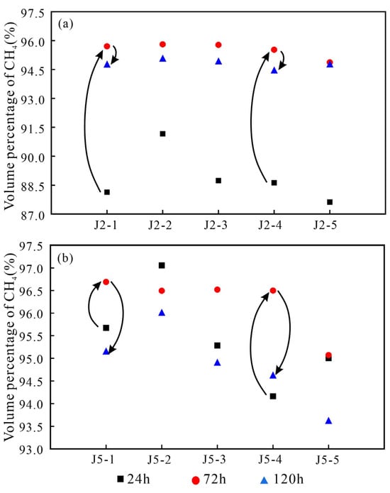 Variation characteristics of CH4 content in CBM during desorption process (24 h, 72 h, and 120 h) of the deep 8# coal of the Benxi Formation in J2 (a) and J5 (b) wells.