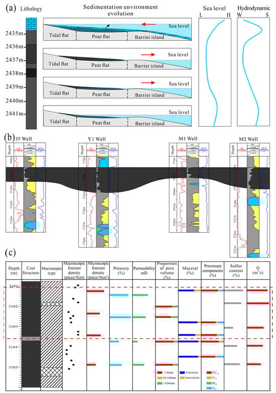 Accumulation mode, changes in sea level, and hydrodynamics of deep 8# coal in the J1 well (a); the east–west coal seam connecting well profile (b); the coal quality, physical properties, gas-bearing intra-layer variation characteristics, and favorable intervals of 8# coal reservoir in the J5 well (c).