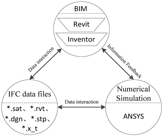 The IFC (Industry Foundation Class) standard is a fundamental standard for data expression and information sharing, specifically for the construction industry [34]. A variety of BIM software can export their intermediate format files for numerical simulation and analysis, thereby solving the problem of information isolation at different stages of the project. The data transfer path based on the IFC standard is shown in Figure 2. In the figure, “*” represents a wildcard for any filename.