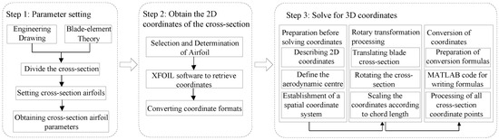 Before constructing the BIM model, it is necessary to have the parameters of the wind turbine blade type for this case study and to process the coordinate data generated from the parameters. Firstly, the 2D coordinates of an airfoil section are obtained from the relevant parameters of blades, and these coordinates are then exported by the specialized airfoil design software XFOIL 6.99. Then, the 2D coordinates need to be processed to obtain the spatial coordinates of the discrete points of each section. In the data processing work, this paper proposes a method for efficiently processing blade data using MATLAB, aiming to enhance the efficiency of blade design and ensure the accuracy of the data used in constructing BIM model. Figure 4 shows this pre-modeling workflow, which comprises three main steps described below.