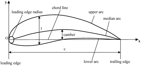 The airfoil parameters include airfoil geometry parameters and airfoil aerodynamic [39] coefficients. Airfoils are generally long and thin, with a rounded leading edge and a blunt or pointed trailing edge. The geometric parameters describing airfoil include chord line, chord (c), thickness (t), camber, leading edge, leading edge radius, trailing edge and arcs (upper, mid and lower), as shown in Figure 5.