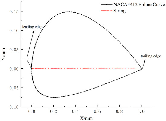 When designing wind turbine blades, several key elements must be considered comprehensively [40], including blade mounting configuration standards, blade twisting angles, system lift-to-drag ratios, thicknesses, materials and so on. This work encompasses dynamics, electrical automation, blade loading, airfoil geometry parameters, composite structures, aerodynamic profile design, airfoil design and other technical functions related to the efficiency of wind turbines. It is critical to select the appropriate airfoil. XFOIL is a commonly used simulation software in airfoil design, which features a specific airfoil database, and a group of 2D coordinates of an airfoil cross-section can be obtained by inputting the required airfoil. The American NACA four-digit airfoil is widely used [41] in wind turbine blade design due to its low drag coefficient and high lift coefficient. Taking the NACA44XX series airfoil as an example, 19 groups of 2D coordinates of blade sections are obtained. There are a total of 160 points for each section. The 2D coordinate file is imported into Inventor 2018, and a spline curve is created based on point coordinates. Then, the 2D coordinate spline curve graph of an airfoil cross-section can be obtained. Taking the NACA4412 cross-section (r = 30.46 m, t/c = 12.22%) as an example, it is shown in Figure 6.