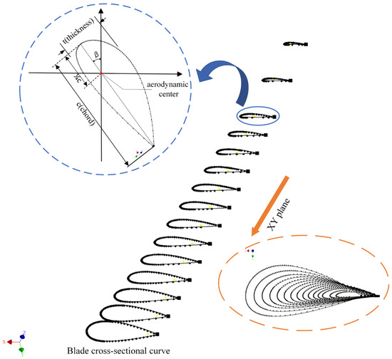 In Figure 7, the yellow points denote the aerodynamic center locus along the blade extension direction (Z-axis). Each point represents the aerodynamic center of its local cross-section, forming the reference axis for aerodynamic analysis. This differs from discrete points defining the cross-section shape (black points).