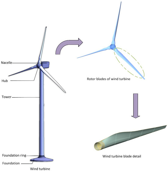 The wind turbines comprise several key components, including blades, hubs, spindles, gearboxes, generators and so on. These components interact with each other and work together to convert wind energy into electrical energy. When analyzing the performance of the blades, placement within the complete system context becomes essential. Thus, it is first necessary to construct a 3D model of wind turbine as a whole, and then the performance analysis of the blade structure can be performed.