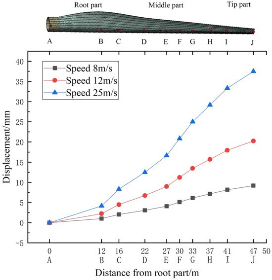 (1) Maximum displacement consistently occurs at blade tip across all working conditions, aligning with rotating blade test measurements where tip displacement accounts for more than 80% of total displacement [50]. This phenomenon is validated by 3D transient simulations capturing rotational stiffening effects: centrifugal forces increase root stiffness by 35–40% while tip stiffness remains 20–25% of the root value.
