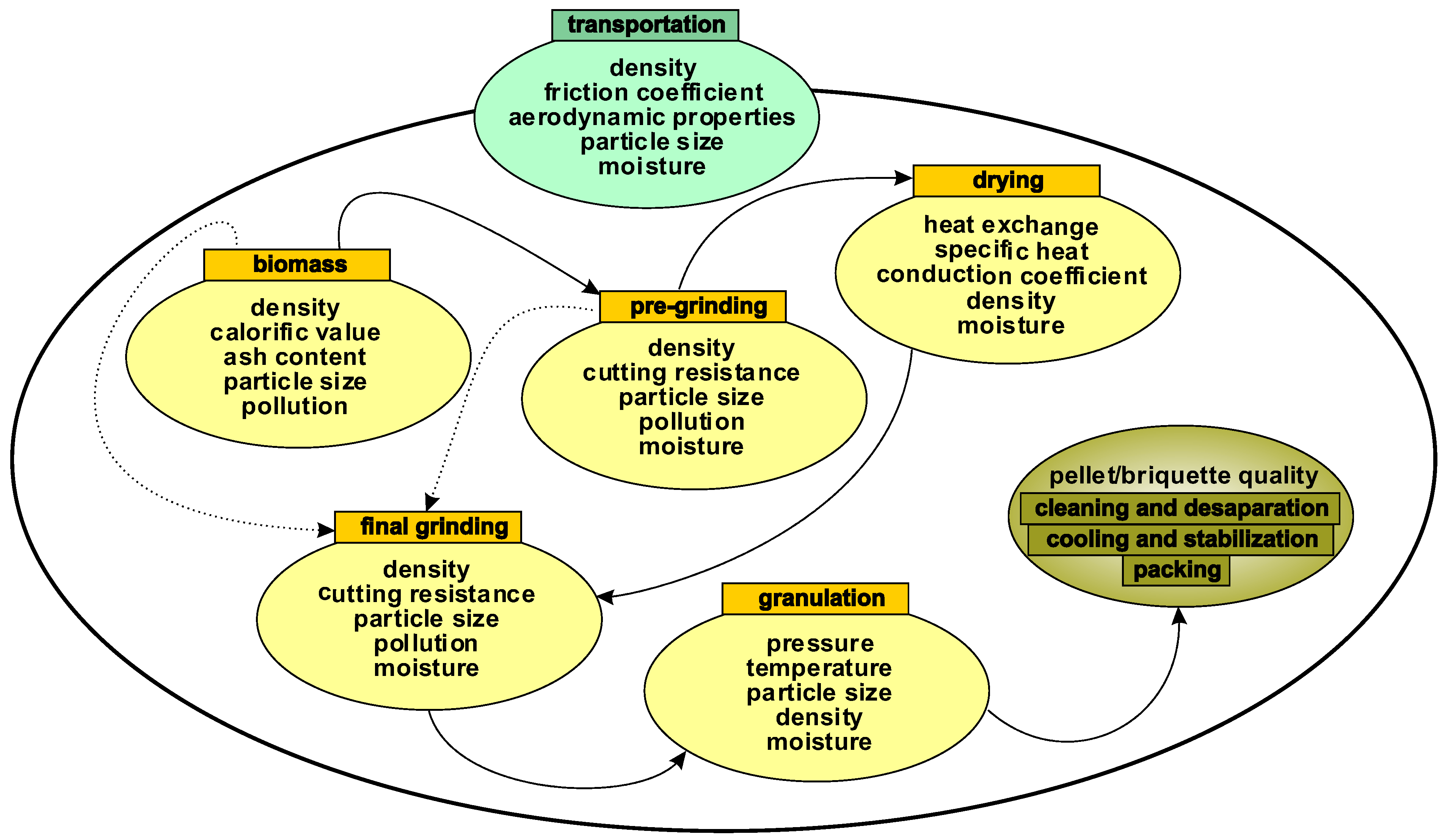 The processing of biomass into briquettes or pellets aims to improve its physical properties by homogenizing and reducing particle size, which is particularly important from the perspective of logistics and boiler feed automation. The agglomeration process involves a complex sequence of operations designed to produce high-quality solid biofuels in granular form (Figure 1). The complexity of this process primarily depends on the type and quality of the biomass feedstock, while its energy demand is influenced by numerous physicochemical properties highlighted in the diagram. Nevertheless, certain stages of the technological chain are always present—such as size reduction, pelletizing or briquetting, and transport.