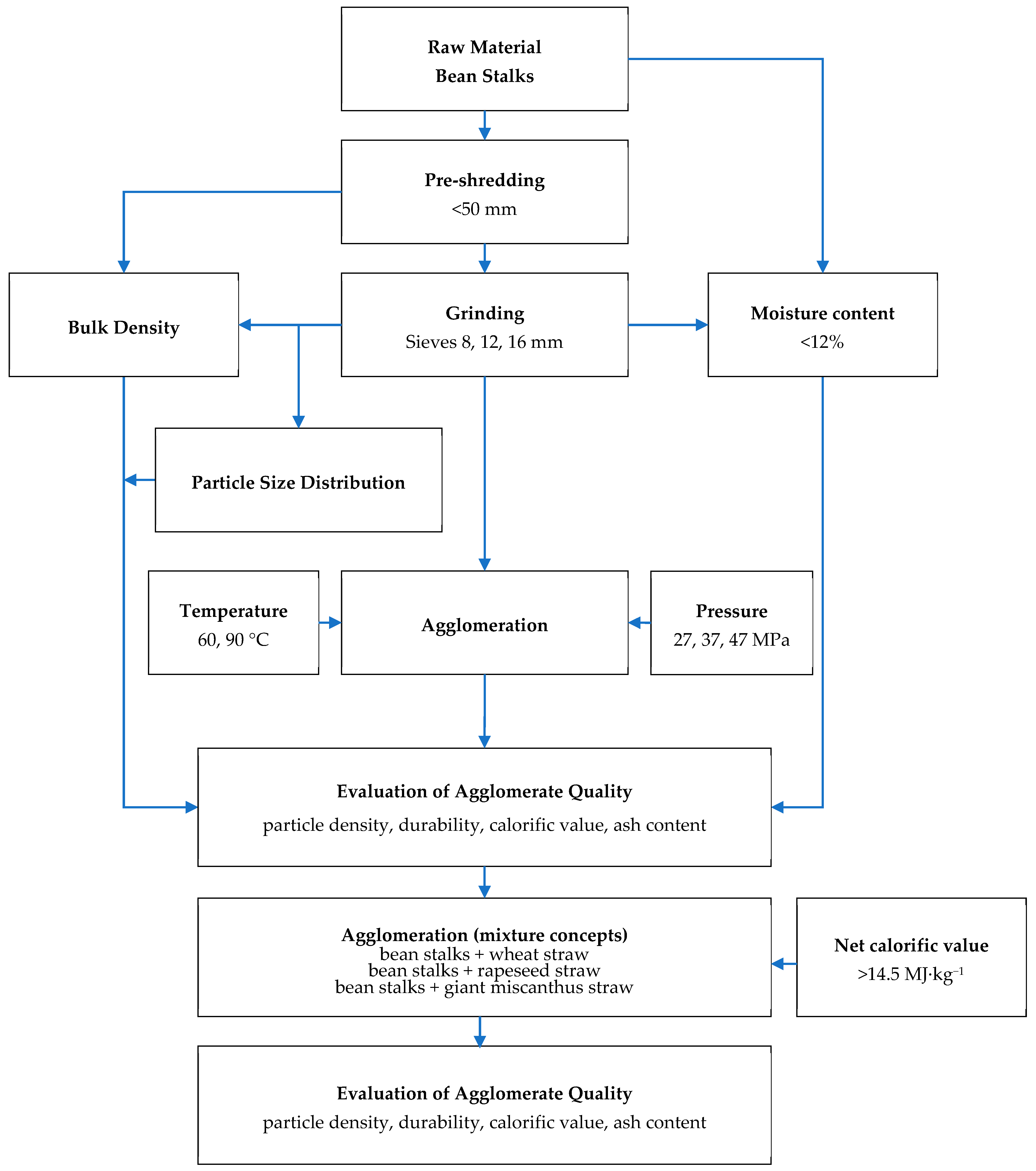 There is a growing interest in the production of biofuels in the form of briquettes and pellets from various types of plant production waste. The most widely studied raw material in this context is cereal straw [16,17,18]. In addition, in line with efforts to reduce waste, lower CO2 emissions, and promote the circular economy, research has been undertaken to explore the feasibility of utilizing other types of plant-based residues. These include, among others, vine prunings [19], vegetable waste [20], coconut shells [21], sugarcane leaves [22], and bean stalks [23].