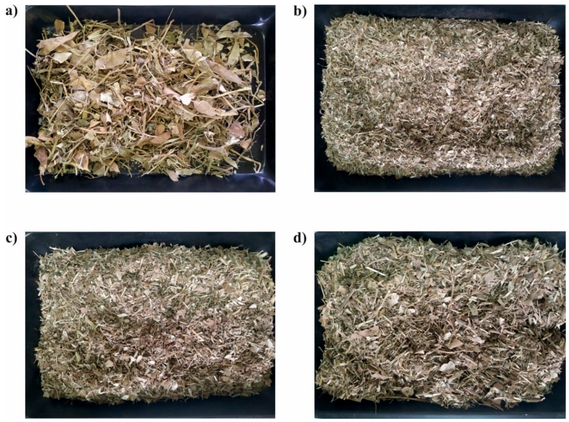 The next stage in biomass processing was final grinding using a milling unit (model MF-4, Protechnika, Łuków, Poland). The device operated at a constant rotational speed of 650 rpm. In order to obtain three distinct particle size fractions, sieves with mesh diameters of 8 mm, 12 mm, and 16 mm were used. Photographs of the resulting fractions are shown in Figure 3b–d.