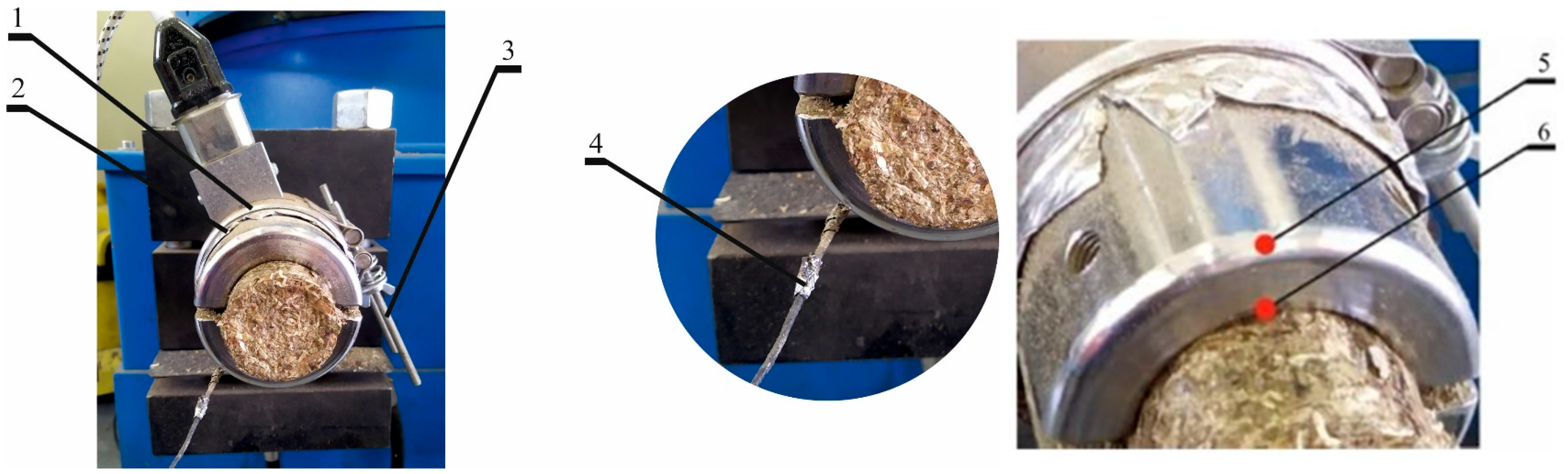 Figure 4 presents the key component of the heating system: a 3 mm thick aluminum clamp (2), permanently equipped with a resistance heater (1). Its main function was to heat the segmented outlet sleeve of the briquetting die to the target temperature in order to improve briquette formation quality. The clamp was mounted onto the die and tightened using a screw knob with a butterfly nut (3), ensuring stability and even heat distribution. The operation of the heating element was controlled by a programmable PLC controller from Delta, which maintained the clamp temperature at 140 °C. As a result, the inner surface of the die reached a temperature of 90 °C, confirmed by measurements at point 6 (Figure 4). The temperature control system was based on a logarithmic algorithm that continuously monitored the temperature using a type K thermocouple (point 4 in Figure 4) and dynamically regulated the heater’s power accordingly.