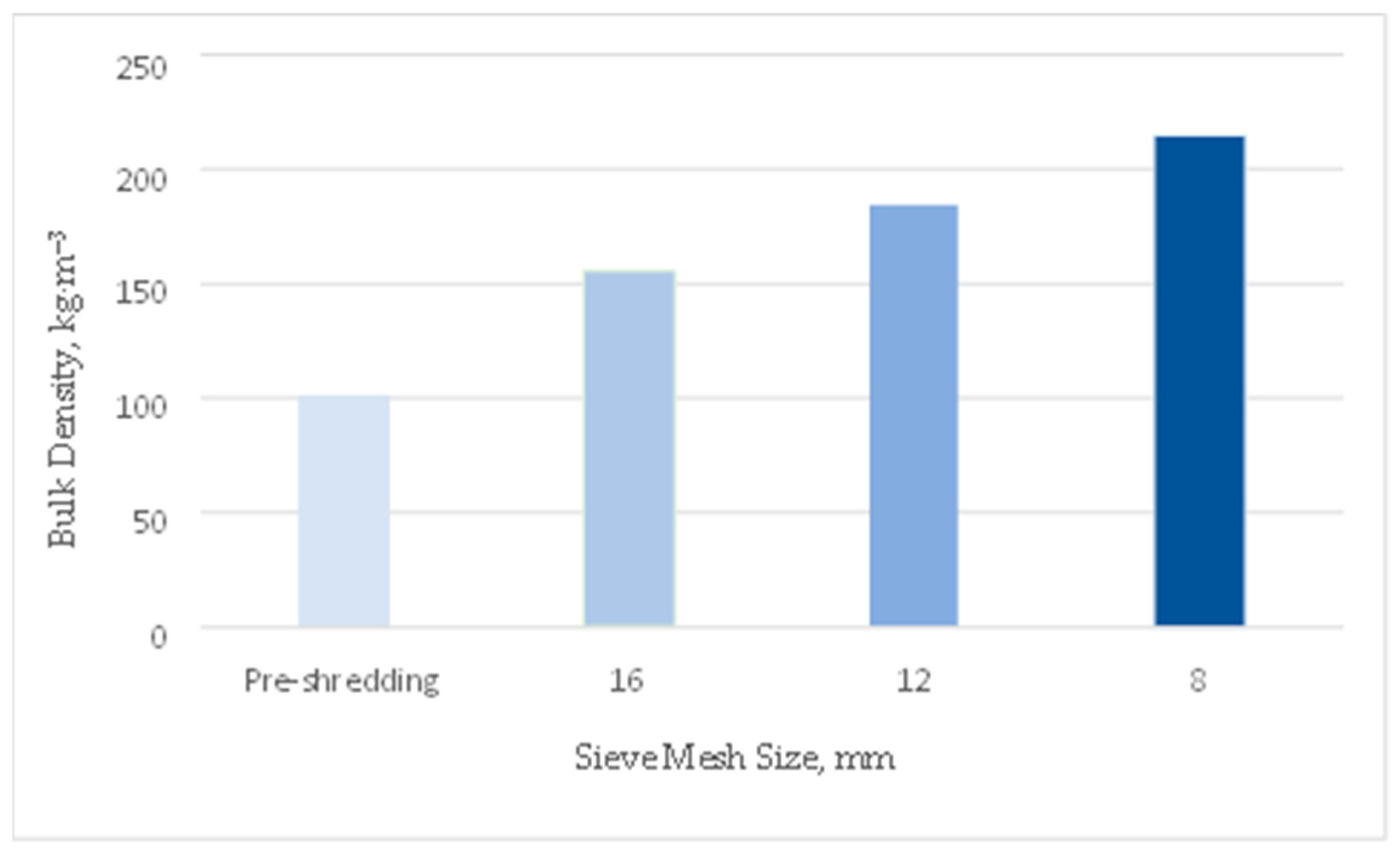 Subsequently, the material was pre-shredded into fractions shorter than 50 mm (Figure 3a) using a stationary Claas chopping machine with axe-type cutting blades (model OPTIMAT, CLAAS, Harsewinkel, Germany). The bulk density of the processed biomass was then determined in accordance with the PN-EN ISO 17828:2016 standard [42], using a cylindrical measuring container with a volume of 0.005 m3. The sample mass was measured using a analytical laboratory balance, with an accuracy of ±0.1 g (model WLC 10/A2, RAGWAG, Radom, Poland). The measurement procedure involved filling the container with the biomass without mechanical compaction. To ensure uniform material distribution, the container was tapped twice by dropping it from a height of 10 cm.