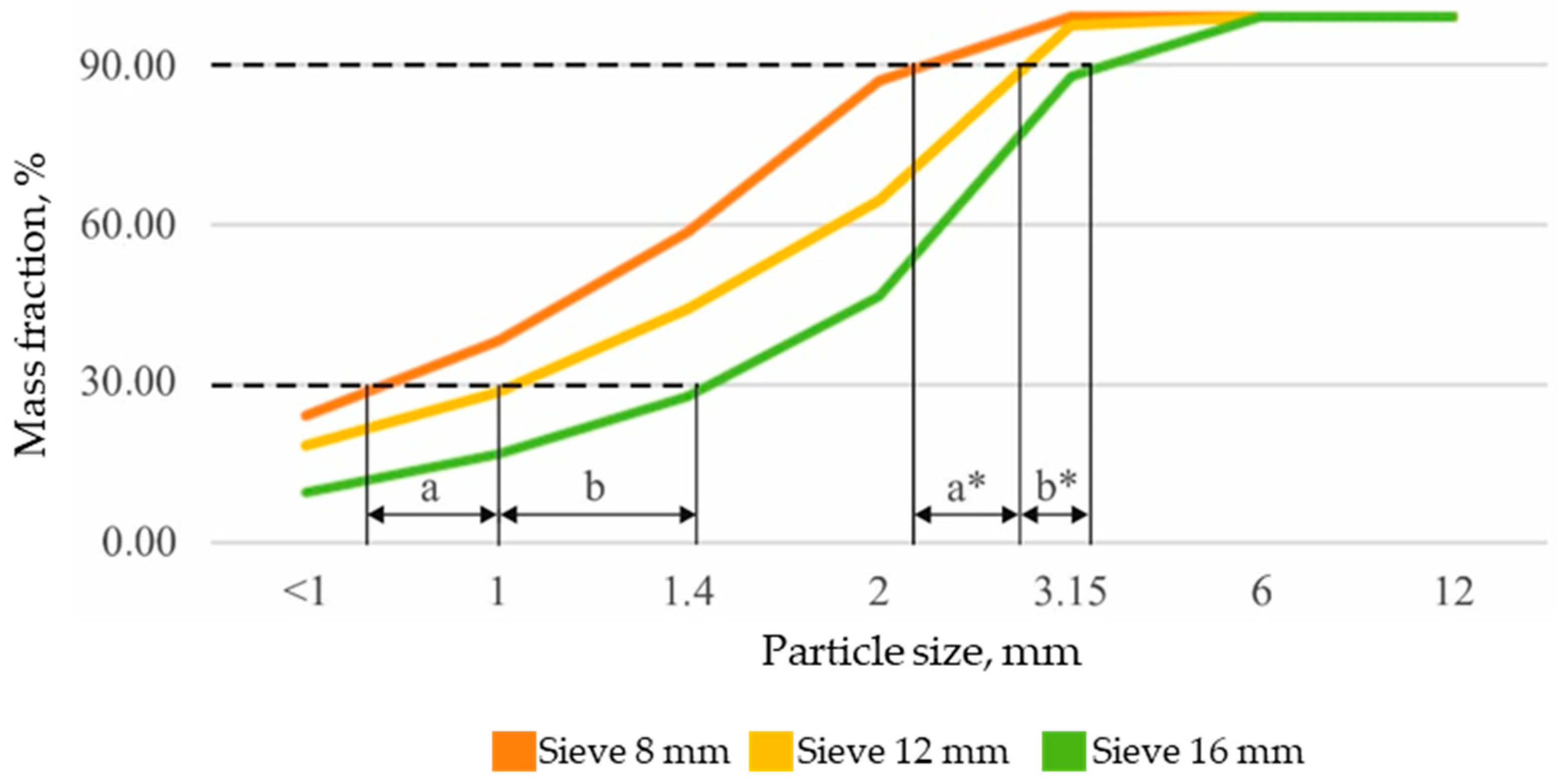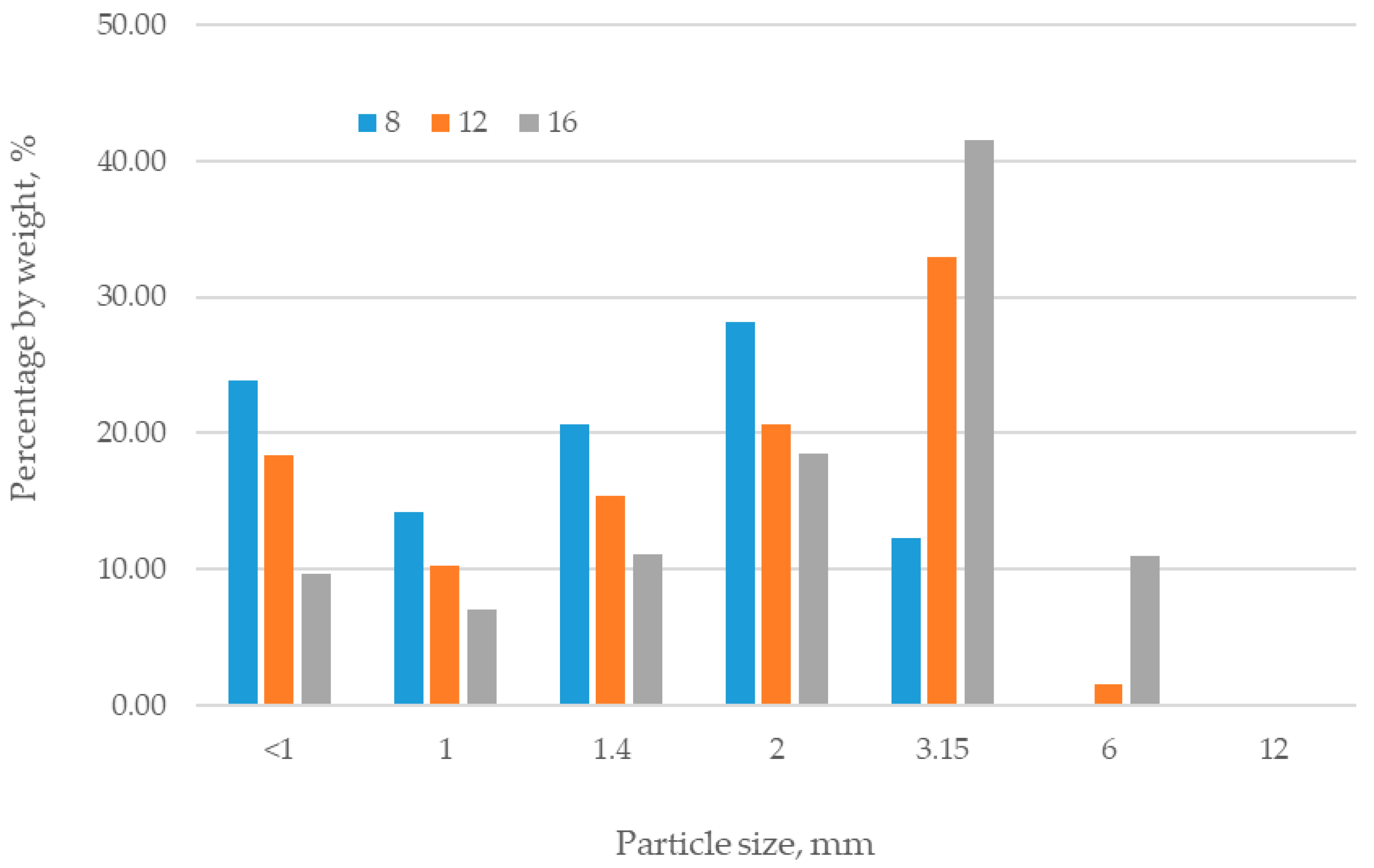For the dried material, a particle size distribution analysis was performed using a laboratory shaker (model LPzE-4e, Morek Multiserw, Marcyporęba, Poland). The test employed a set of sieves with mesh sizes of 1 mm, 1.4 mm, 2 mm, 3.15 mm, 6 mm, and 12 mm. Each test lasted 5 min, and the sample mass used was 350 g. Measurements were repeated three times for each sample.
