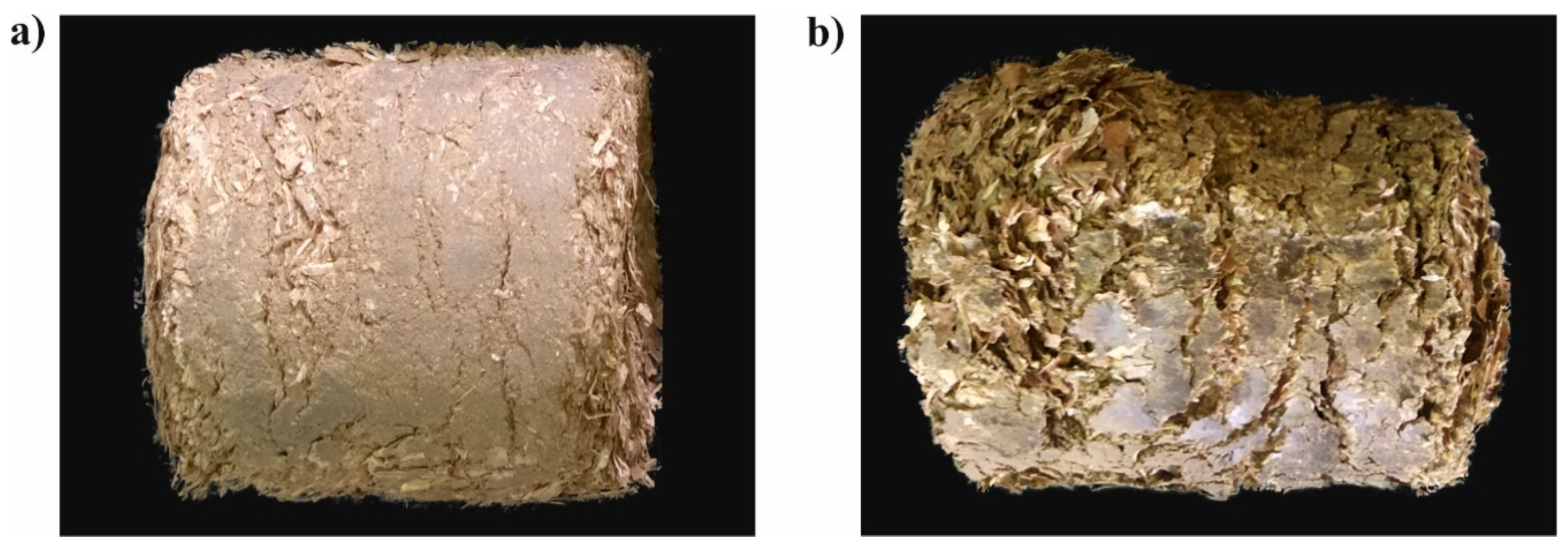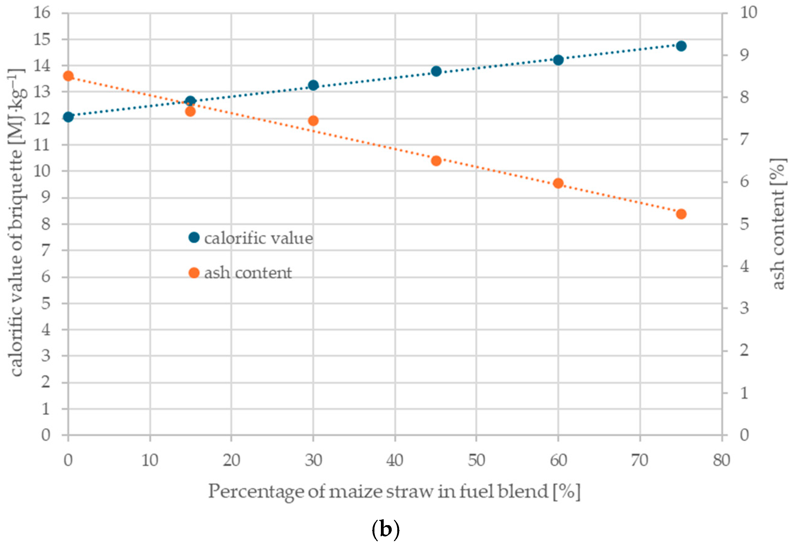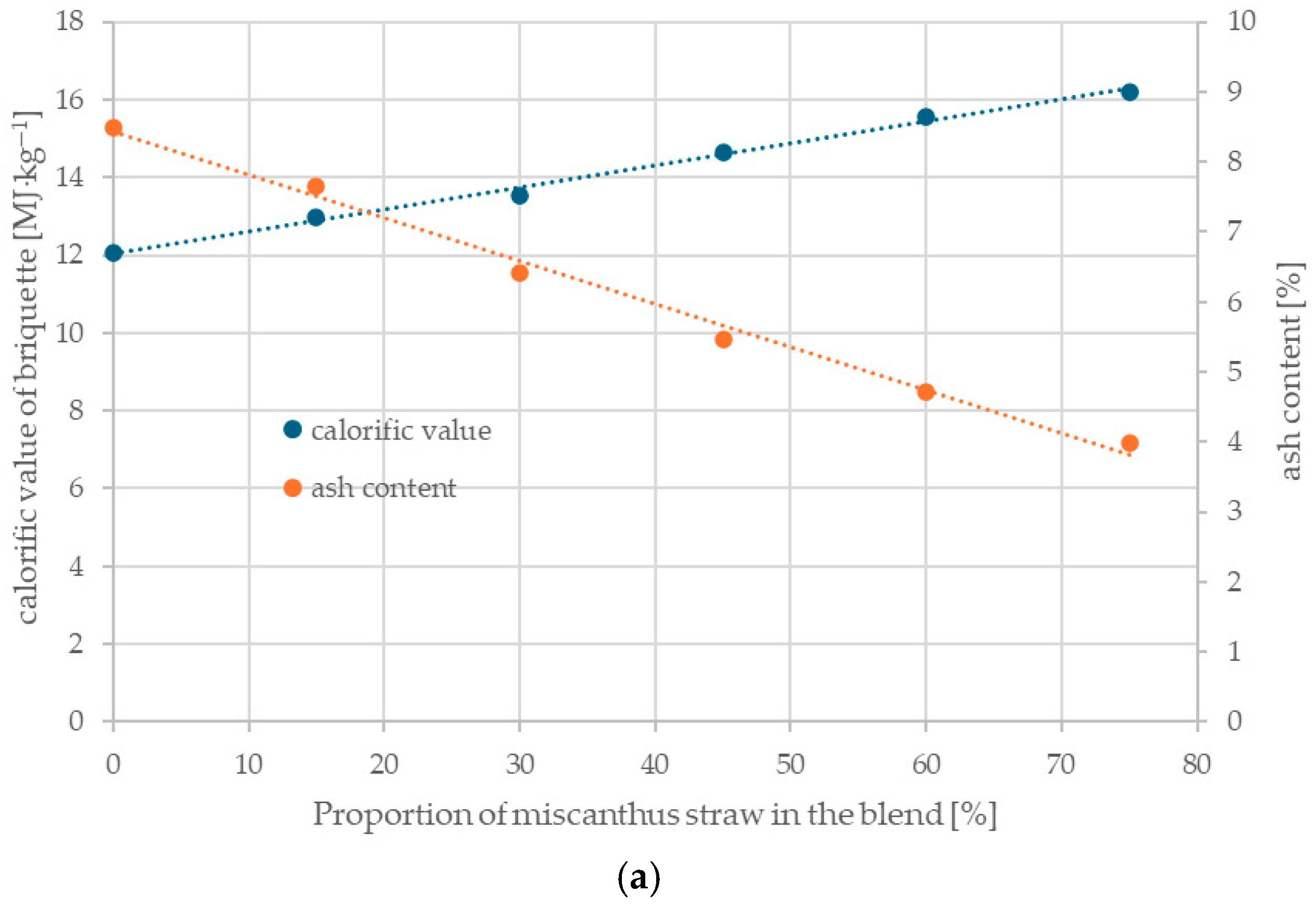 In the case of briquettes made from non-woody biomass, the standard “PN-EN ISO 17225-7: Solid biofuels—Fuel specifications and classes. Part 7: Graded non-woody briquettes” [31] defines the basic requirements that must be met for a briquette to be classified as A or B. In addition to origin and source, the standard also specifies recommended values for parameters such as moisture content, dimensions, ash content, particle density, additives, net calorific value, and the content of selected chemical elements. According to the research presented by Marreiro et al. [28], the most important quality parameters of solid biofuels are calorific value, moisture content, durability, ash content after combustion, and bulk density.