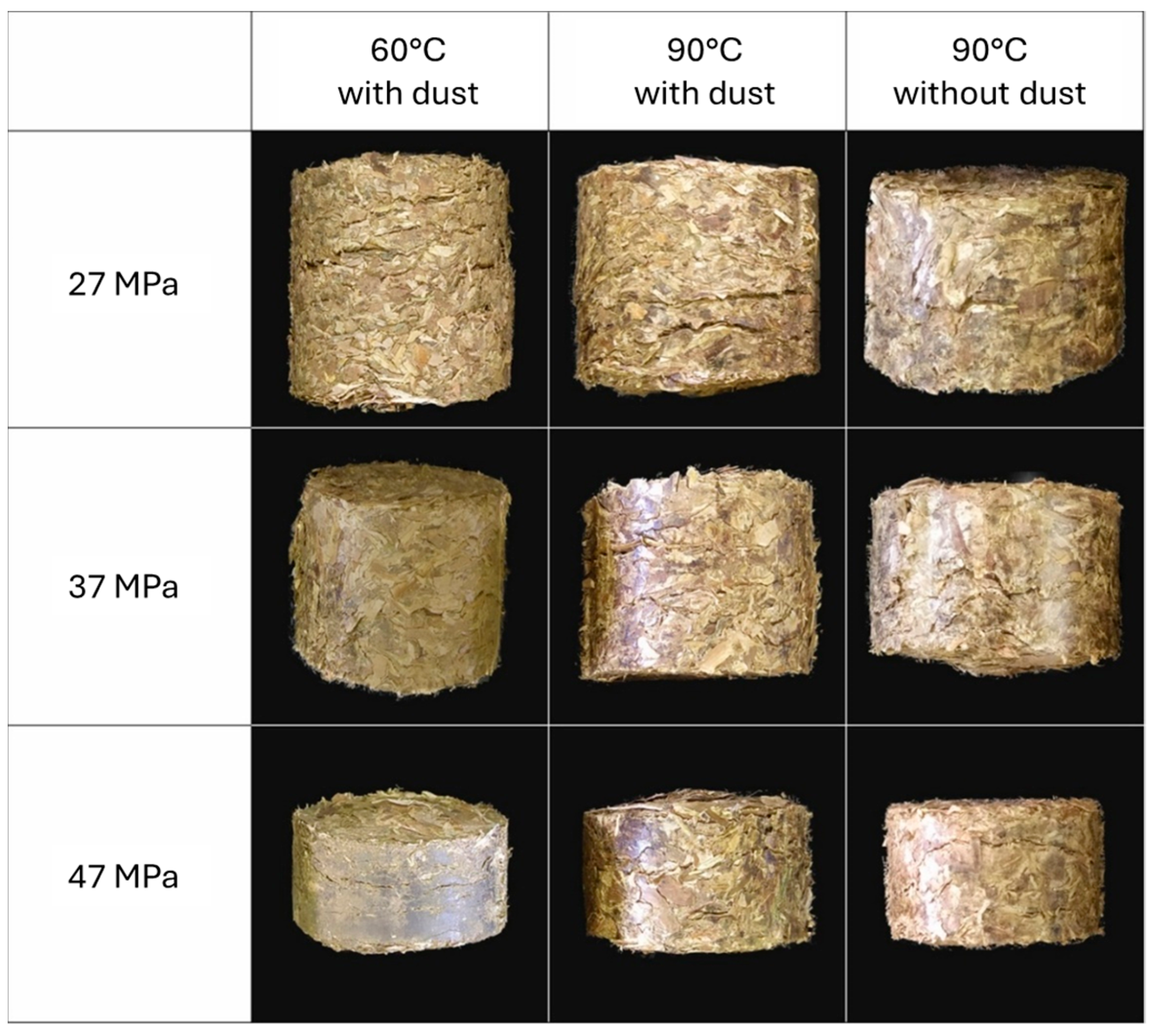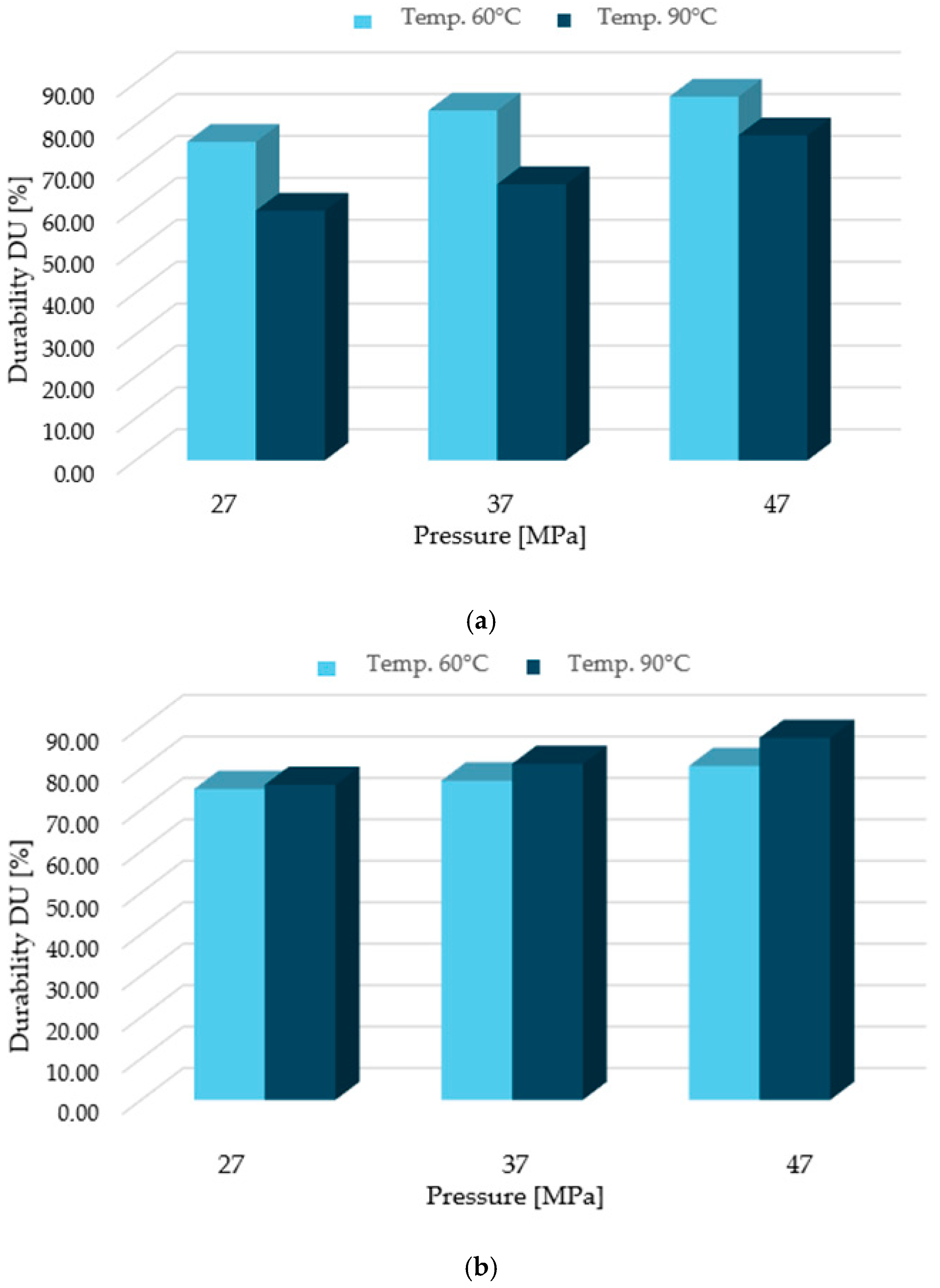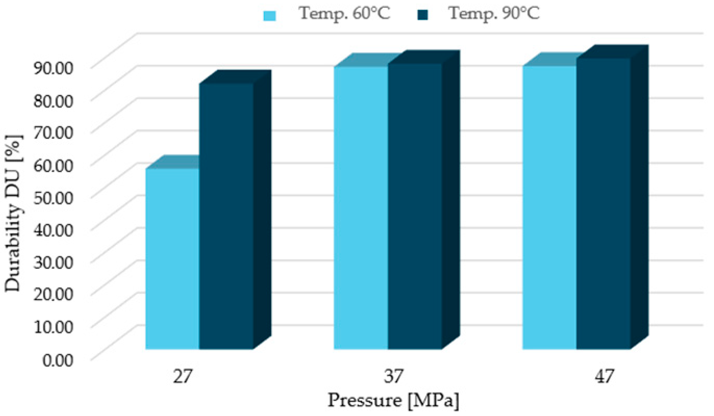 Studies by Frączek [11], Adam [1] and Marreiro [28] confirm that increasing compaction pressure improves briquette density and mechanical strength. Similarly, Fiszer [9] and Orisaleye [29] demonstrated that higher temperatures contribute to improved briquette density and durability.