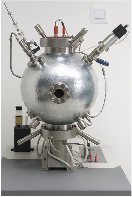 The experimental measurements reported in this work were collected by means of the 20 L combustion vessel shown in Figure 1. Also, Table 1 shows a detailed description of the experimental set-up, which comprises the following components. The combustion chamber was designed as a spherical stainless steel container with a volume of 20 dm3 (D = 340 mm), including two piezoelectric pressure transducers (±0.1% FS) and a type-K thermocouple (±1 K), water-jacketed with PID control (±0.5 K). Stainless steel was chosen for its corrosion resistance against reactive substances and combustion by-products, as well as its high-temperature durability, both crucial for combustion testing. The equipment was carefully selected to withstand pressures of up to 15 bar, ensuring durability and reliability under demanding experimental conditions. The spherical chamber is equipped with specialized ports for introducing and removing test gases and injecting or extracting the methane–air mixture. For mixture preparation we used partial pressure filling to φ = 1.00 ± 0.005, evacuation to 50 mbar, and 120 s mechanical stirring for homogeneity. For ignition and data acquisition, we applied a 0.2 mm Ni–Cr wire at 1 kV for 20 µs, and pressure was sampled at 150 kHz. For a repetition and error analysis, we used five independent runs per condition; the reported Pmax, (dP/dt)max, LBV, and KG are means ± one standard deviation. Instrumental uncertainties (pressure ±0.1%, temperature ±0.3 K, timing ±0.02 ms) were propagated through the model, yielding combined uncertainties of ±3% for LBV and ±5% for KG. This set-up allows for the precise control of the gas composition within the chamber, which is essential for accurate and reproducible experimental results. Such control ensures that the experimental conditions replicate real-world scenarios, facilitating the transfer of the findings to practical engineering applications. Temperature within the chamber is monitored using a thermocouple positioned to avoid interference with the flame path. Temperature readings are displayed on a monitor located at the base of the apparatus for immediate observation.