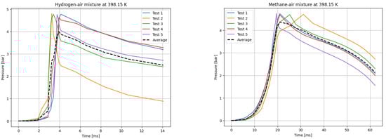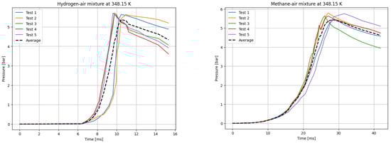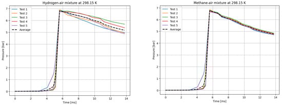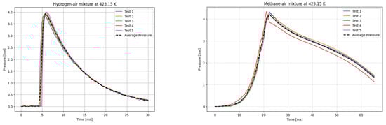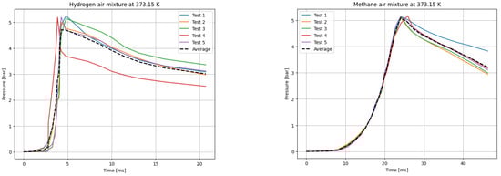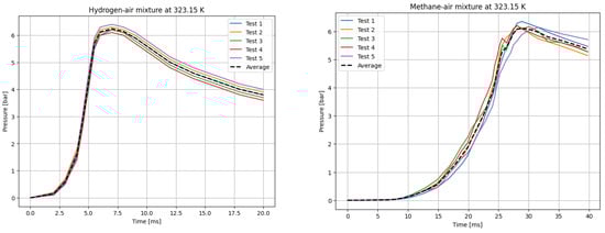 The deflagrations of H2 and CH4 with air at the stoichiometric ratio ( were carried out for six different initial temperatures of the mixtures. Five measurements were taken for each initial temperature T0, each according to the test procedure presented. The recording frequency of the reaction explosion parameters was maintained at 150 kHz. The initial pressure for each trial was P0 = 1 bar. The results of a single trial are plotted as a curve of explosion pressure increase over time. The summary curves of the five measurements for T0 = 298.15 K are shown in Figure 2, for T0 = 323.15 K in Figure 3, for T0 = 348.15 K in Figure 4, for T0 = 373.15 K in Figure 5, for T0 = 398.15 K in Figure 6, and for T0 = 423.15 K in Figure 7. The temperatures were chosen for the LBV test because they represent typical operating temperatures for many hydrogen- or methane-fueled systems. These temperatures are also easy to achieve and precisely controlled, making them ideal for laboratory testing.