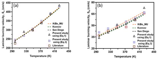 Figure 8 presents the variation in LBV at elevated reaction temperatures ranging from 298 to 423 K, as obtained from newly collected experimental data, numerical calculations using three kinetic mechanisms, and values reported in the literature.