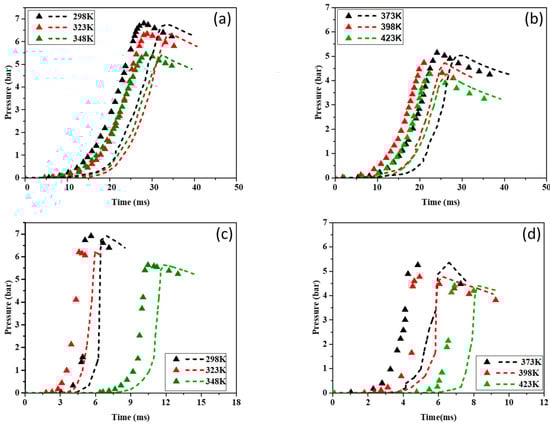 Figure 9 illustrates the P-t curves for CH4–air and H2–air mixtures over the studied temperature range (298–423 K). The simulated pressure–time histories generally follow the same trend as the experimental results across all tested temperatures, although minor deviations are observed. Notably, in graphs (a) and (b), ignition occurs later in the simulated cases compared to the experimental conditions.