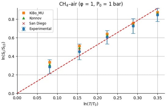 Because we only study the temperature dependence, the values of were calculated having considered the unity for the equivalence ratio. For each fuel (H2 and CH4), we assembled LBV data as a function of the initial temperature from the measured experimental pressures at φ = 1 and p = 1 atm [] and computed LBV from three kinetic mechanisms (KiBo_MU, Konnov, San Diego) under the same conditions. We then chose a reference state at T0 = 298.15 K with reference LBV0 = LBV(T0) from the experimental dataset. For each higher temperature Ti in the set {323.15, 348.15, 373.15, 398.15, 423.15 K}, the local exponent αi was computed via the log–log definition: