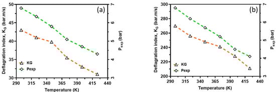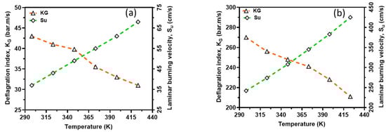 In order to capture the intrinsic reactivity of CH4–air and H2–air mixtures, the deflagration index was obtained from the P(t) history of a 20 L closed explosion vessel together with LBV and is shown in Figure 12. From this figure, the deflagration index showed an inverse relationship with the reaction temperatures, whereas laminar burning velocity showed a direct relationship with the reaction temperatures. This is because the initial temperature has a great influence on the explosion pressure, consequently dictating the maximum rate of pressure rise in the vessel and, therefore, the deflagration index. In other words, an increasing initial temperature has an inverse relationship with explosion pressure and thus KG. However, there is too much inconsistency in the measured deflagration index, as reported by several authors [,,,], ranging from 30 to 86 bar*m/s for CH4–air and 215 to 1100 bar*m/s for H2–air mixtures under standard conditions. The present study’s index lies in the range experimentally reported in the literature. For instance, for methane, the closest experimental results reported in the literature to those calculated are from the project SAFEKINEX []. From this observation, it can be said that the deflagration index and LBV are sensitive to initial temperatures, which are consistent with the literature. Overall, the deflagration index showed an inverse relationship with flame propagation. Furthermore, the relationship between the explosion pressure and the deflagration index is shown in Figure 13 within the studied temperature ranges. It can be seen from this figure that the deflagration index has a direct relationship with the explosion pressure and the maximum pressure rise rate, because the maximum rate for pressure rise has a similar relationship with the maximum explosion pressure.