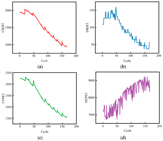 As shown in Figure 4, there is a relationship between the features and the cycle number: CIKRT, DIKRT, CTPKT, and IVAI exhibit an overall decreasing trend as the cycle count increases, whereas MTPST and IVCRAI show an overall increasing trend.
