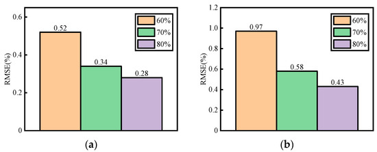 The horizontal axis represents the number of charge-discharge cycles, and the vertical axis denotes the SOH. Taking B0018 as an example, as shown in Figure 10, increasing the size of the training set generally helps the model learn more critical feature information, thereby yielding higher prediction accuracy. When using a 60/40 split, the features learned are not sufficiently comprehensive; with a 70/30 split, the model training is relatively complete and demonstrates good predictive performance. Figure 11 presents the specific prediction accuracy under different split ratios. From Figure 11, it can be observed that as the data volume increases, SOH prediction accuracy improves. Using 60% of the degradation data to predict the remaining 40% yields the lowest accuracy, whereas using an 80/20 split does not result in a significant change in accuracy, a phenomenon similarly reported in [41]. Notably, for certain cells such as B0005 and B0007, increasing the split ratio to 80% provides only limited improvement in accuracy. Overall, using 70% of the data already meets high-accuracy requirements. Based on this analysis, this study adopts the common 70/30 dataset split.