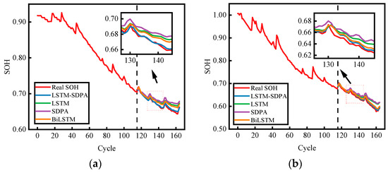 As shown in Figure 12 and Figure 13, the proposed LSTM achieves superior prediction accuracy on all four batteries compared to the conventional LSTM and the Bi-LSTM that leverages bidirectional information, with its prediction curves more closely matching the ground truth. The error plots indicate that, relative to the conventional LSTM, the improved model exhibits significantly reduced error fluctuations and lower error levels during the later cycle stages, demonstrating that the dynamic scoring mechanism of scaled dot-product attention helps focus on salient temporal features and effectively enhances the model’s representational capacity. The LSTM-SDPA attains a minimum MAE of 0.26% and a minimum RMSE of 0.34%, with the maximum error among these metrics not exceeding 0.58%. Relying solely on voltage-domain signals, the model still achieves relatively precise predictions. Moreover, when the SDPA mechanism is applied without the LSTM encoder, there is no sequential information provided by the encoder, and the unencoded inputs are fed directly into the attention module. Since the scaled dot-product attention itself treats inputs as unordered, using SDPA without an encoder, such as LSTM, has a limited effect on SOH prediction. This indicates that, in the absence of effective temporal encoding, the model struggles to stably capture degradation patterns. By contrast, LSTM-SDPA weights the LSTM’s historical hidden states, reinforcing prediction accuracy and thus yielding better performance. The ablation results show that introducing the SDPA mechanism leads to improved performance of the enhanced LSTM in the prediction task, validating the effectiveness of this modification. Using only the SDPA mechanism or employing a bidirectionally encoded LSTM alone cannot achieve the same effect, which demonstrates the significance of combining temporal encoding with weighted full hidden-state representation.