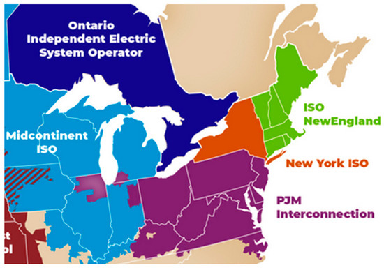 Many of the Northeastern states participate in the Regional Greenhouse Gas Initiative (RGGI), through which carbon trading is enabled by a cap-and-trade program for CO2 emissions permits. The effect of carbon trading on wholesale energy prices has been extensively studied for California and the Pacific Northwest [25,26]. However, the effects of carbon trading on prices in the PJM Interconnection (PJM), the New York Independent System Operator (NYISO), and the market operated by the Independent System Operator of New England (ISO-NE) have received less academic attention. When retail electricity pricing captures the wholesale energy price increase attributable to the marginal cost of carbon, it improves the economic efficiency of retail electricity consumption and the cost-effectiveness of distributed energy resources.