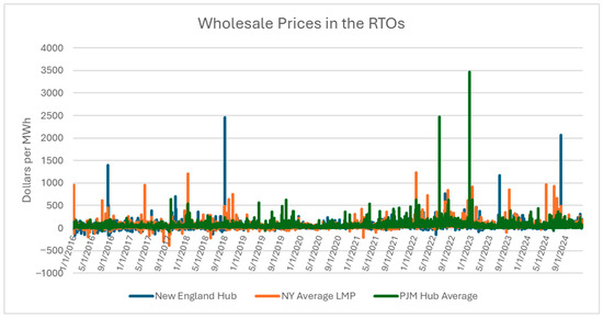 The wholesale prices are positively correlated among the three markets in the Northeast for four reasons. First, these hourly energy prices move with the wholesale natural gas prices, as natural gas is often the marginal generation fuel, although the correlation among movements in wholesale natural gas prices at various trading points in the Northeast tends to be limited. Second, the cross-border price effects of fundamental drivers of wholesale prices, such as the system load, VRE generation, nuclear generation, and hydro generation, exist in interconnected markets [25]. Third, a multistate event like a summer heat wave, winter ice storm, or transmission failure will impact the energy prices in each of the geographically close, interconnected wholesale electricity markets. Finally, the import of hydropower from Canadian provinces (Ontario, Quebec, and New Brunswick) may reduce prices throughout the region.