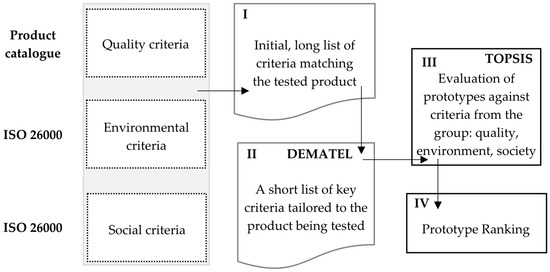 QES is supported by multi-criteria decision-making methods, DEMATEL (decision-making trial and evaluation laboratory) [24], which was implemented due to the need to search for mutual influences of criteria, which are numerous and belong to different groups (quality, environment, and society). Then TOPSIS (Technique for Order Preference by Similarity to an Ideal Solution), which was implemented to evaluate prototypes according to the states of criteria belonging to the mentioned groups (quality, environment, society), where this method is used when the evaluated parameters can be measurable and non-measurable [25]. Another key element of the model is the list of social responsibility criteria (taking into account the environmental area), which is presented in the ISO 26000 standard [26]. It provides a standardised set of environmental and social criteria, which, in the offered model, are subject to initial selection and subsequent evaluation as the selection of the most advantageous product prototype.