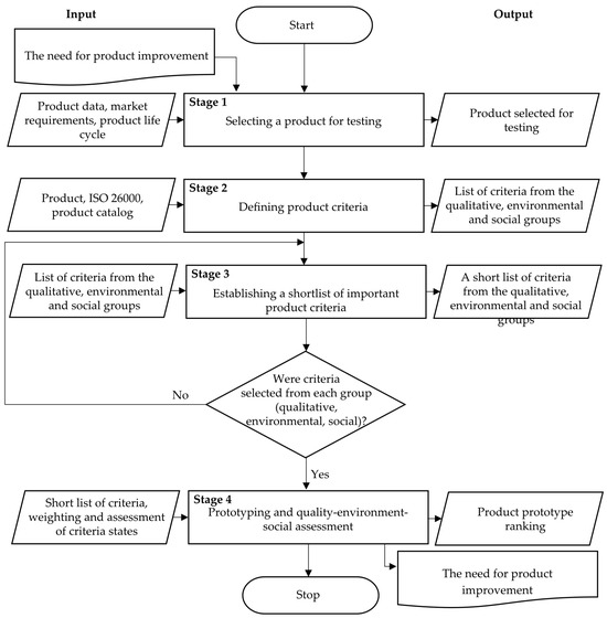 The nature of the model is based on an in-depth assessment of the product in terms of the following criteria: quality, environmental impact, and social responsibility [32]. At later stages, the analysis is also supplemented with the cost aspect but is expressed by a measurable value in the form of estimated product costs [33]. Hence, at this stage of the model, it is necessary to define the product criteria. Firstly, product quality criteria, that is, customer satisfaction with the use of the product (measurable and non-measurable criteria) [27]. Secondly, the impact of the product on the environment [34]. Thirdly, the impact of the product (and company activities) on society, demonstrated through clear and ethical behaviour [35]. No total, maximum number of criteria is assumed in these three groups; however, following the authors of [31], it is possible to assume that it would be effective for the number of criteria in each group to be comparable and amount to up to 10 criteria.