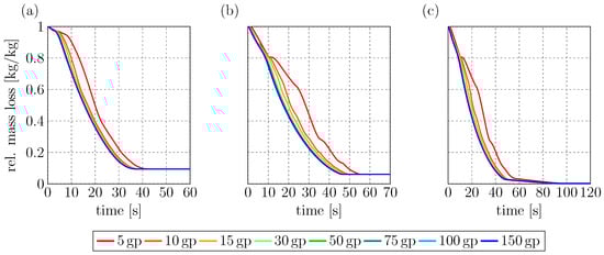 Based on the approach from [7] biomass particles with 9 different diameters (50 , 75 , 100 , 150 , 200 , 250 , 300 , 350 , 500 ) were chosen for the following study of their conversion behavior. For each diameter 1000 particles were injected to allow for a statistical analysis of their behavior. The RLPM parameters used to model the properties of biomass are listed in Section 3, Table 1, Table 2, Table 3, Table 4 and Table 5, with 100 internal grid points. Particles are typically dried before being injected into the RW of the BF, which leads to the relatively low moisture content of 8% listed in Table 1. The low moisture content and expected internal gradients for the larger particle diameters are the reasons for the choice of validation experiment in Section 4. In the validation the RLPM showed the best results for the dry pyrolysis case.