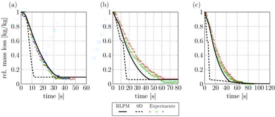 The validation for the use of the RLPM over 0D Lagrangian particle models in OF is presented here. The validation uses the experimentally obtained mass loss curves of biomass decomposition data by Lu et al. [23]. In these experiments spherical poplar wood particles with diameters of are thermochemically converted under varying conditions. Three cases are considered: pyrolysis of dry wood, pyrolysis of wet wood (both under N2 atmosphere), and the combustion of wood (under air atmosphere).