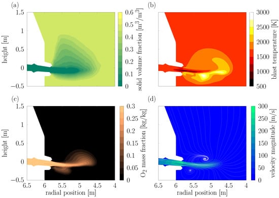 Two-dimensional cuts along the particle injection axis of the simulated 3D RW. The particles and hot blast are injected through the tuyere on the left side. Shown are (a) the solid volume fraction, (b) blast temperature, (c) O2 concentration, and (d) velocity magnitude.