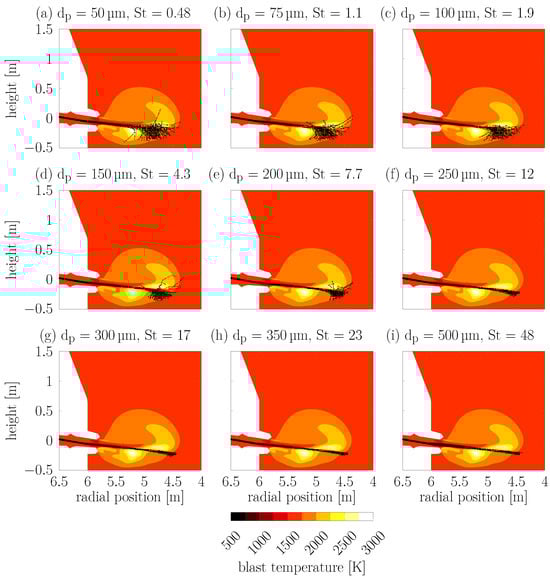 Particle trajectories with indicated blast temperature for each particle diameter. The initial Stokes number (St) is indicated above each plot. Particles with larger St do not follow the gas flow and travel in between regions of highest temperature.